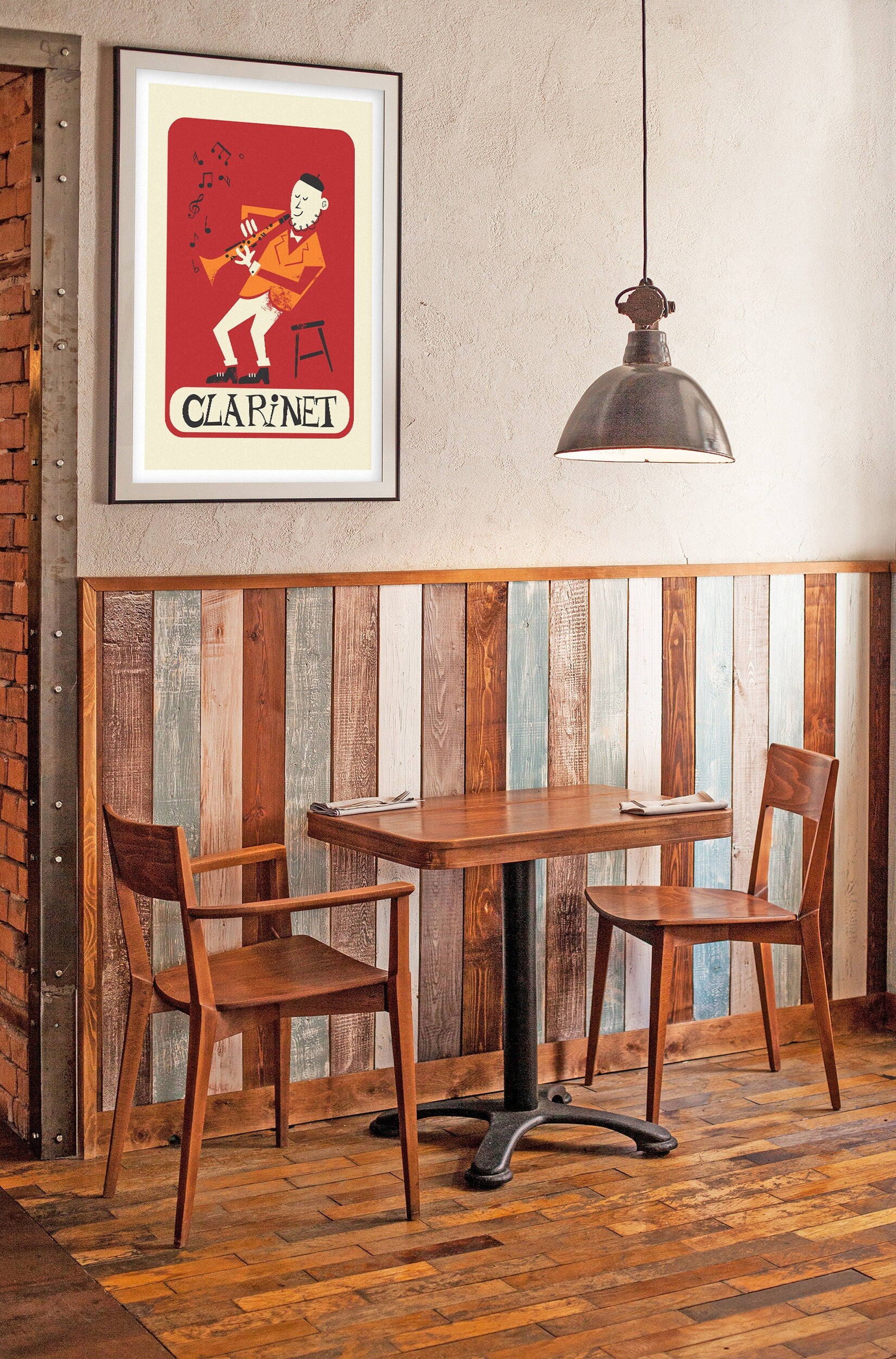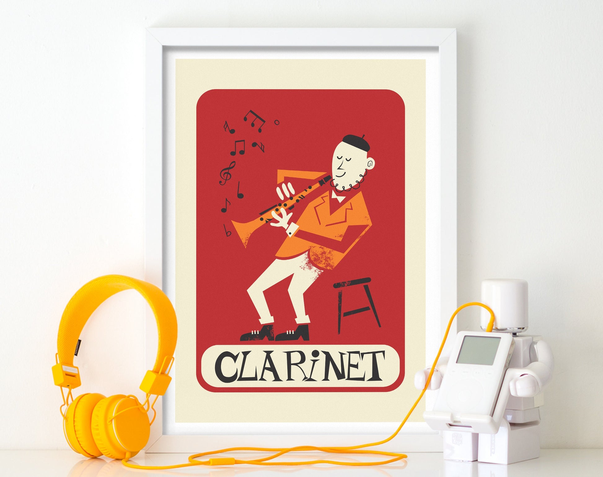 This clarinet player poster is a fantastic music studio decoration. Created in a minimalist Mid-century style, the palette is a combination of a saturated orange, a reddish burgundy, plain black and cream khaki - but you can customize the colors, as explained below!