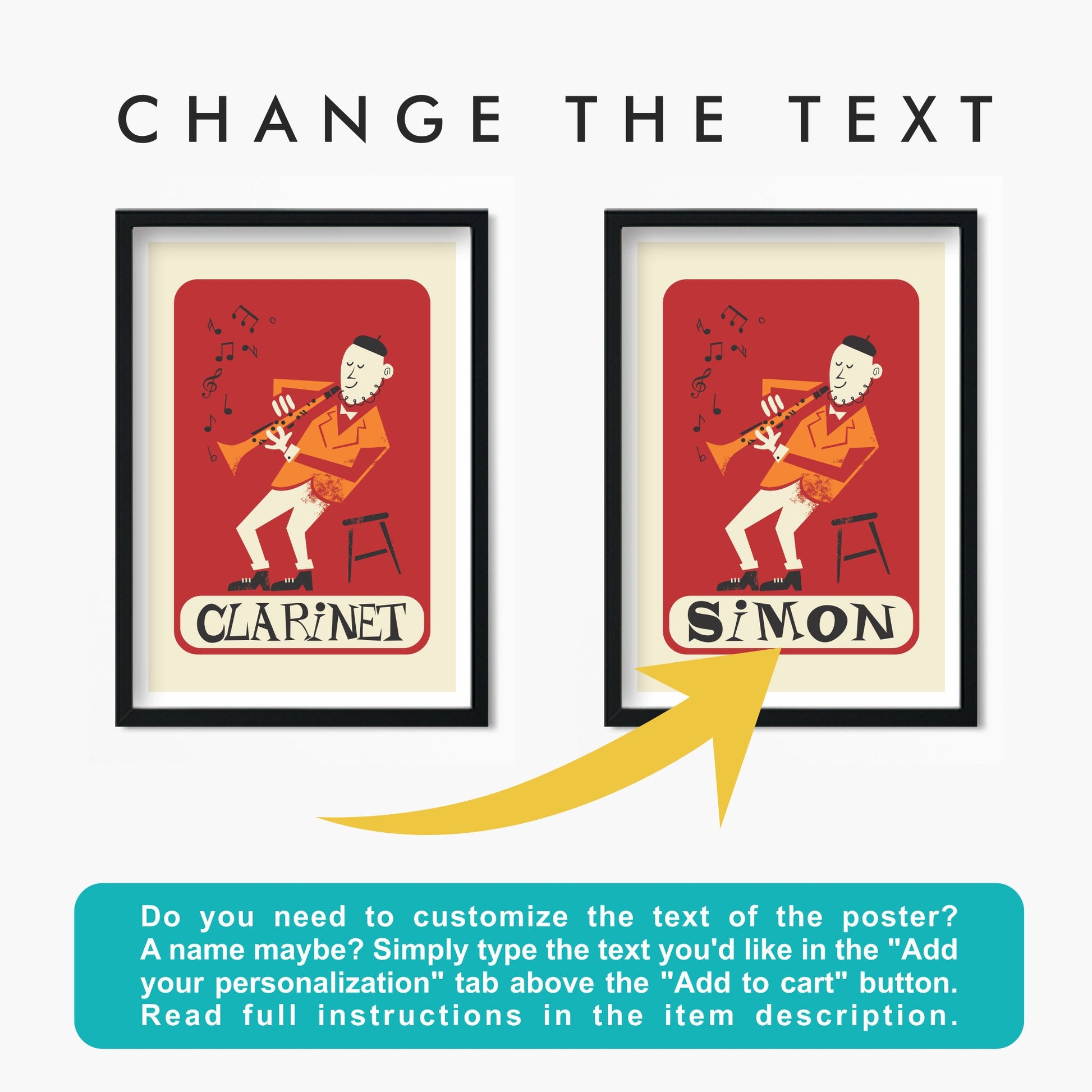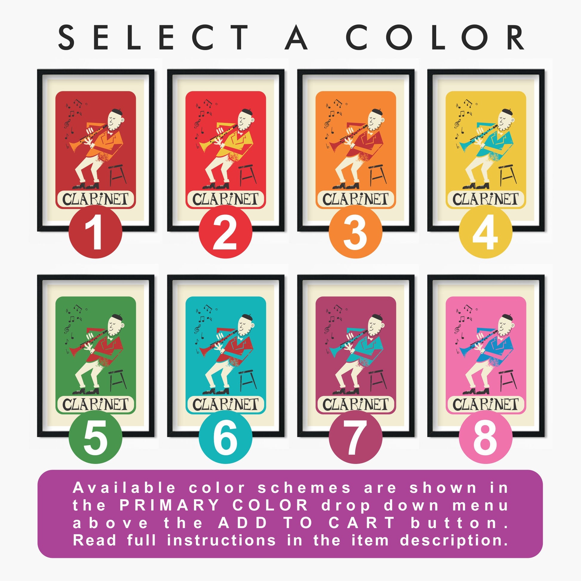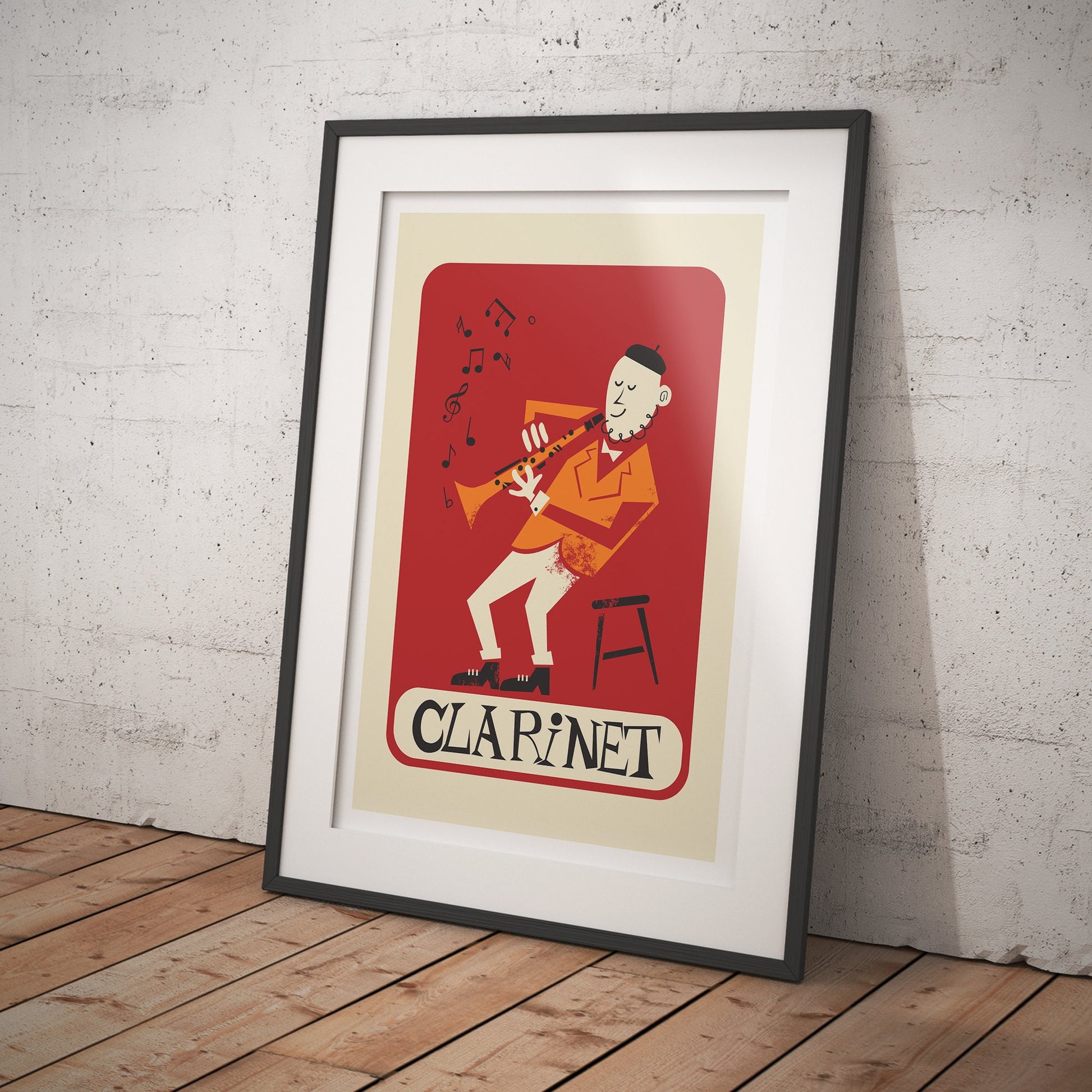 Clarinetist Poster, Clarinet Mid 50s Illustration Print, Personalize & Pick Your Color