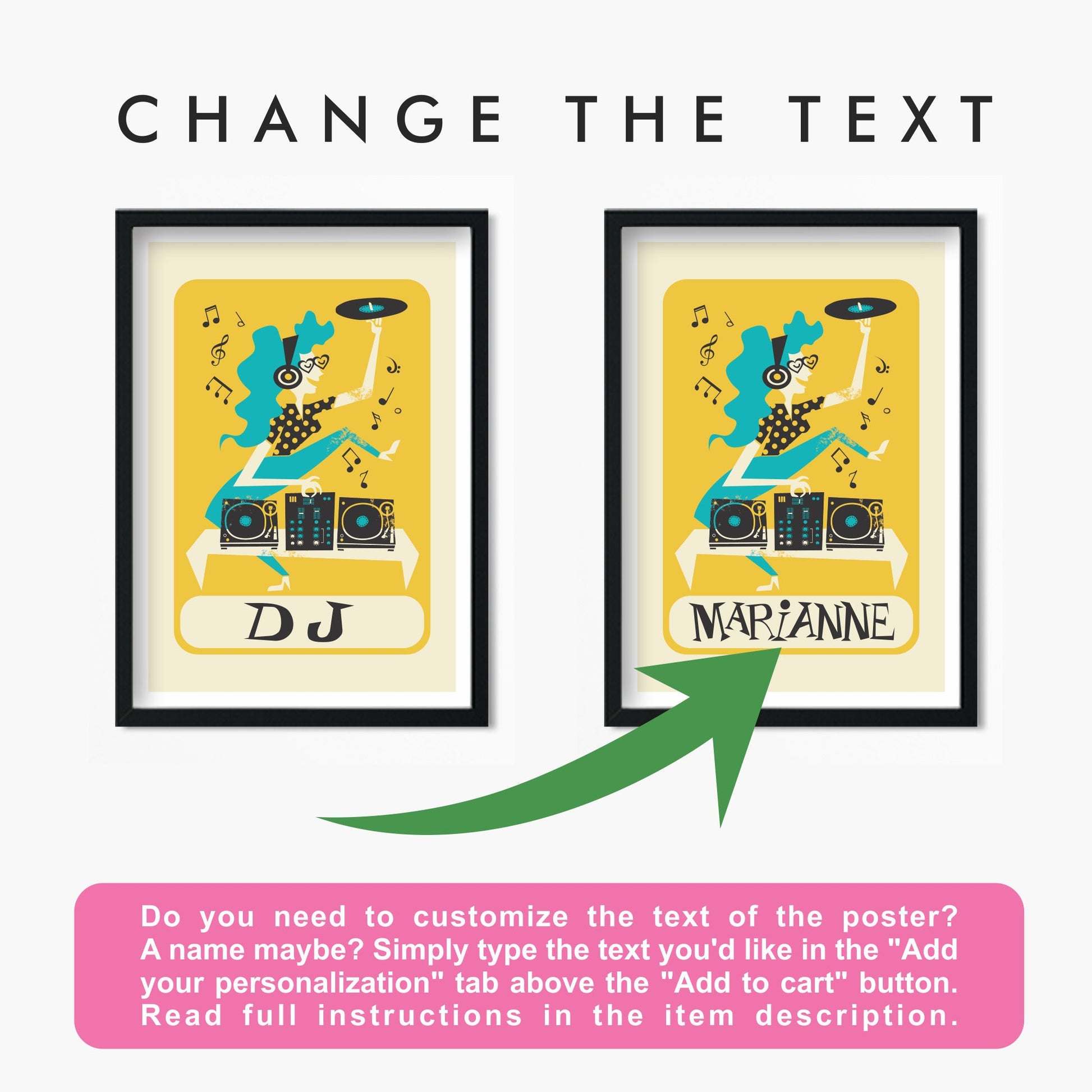 -1. Do you need to change the text of the poster? A name maybe? At Your Cart, simply fill up the "Order special instructions" box, at the bottom left, below the photo of the item.