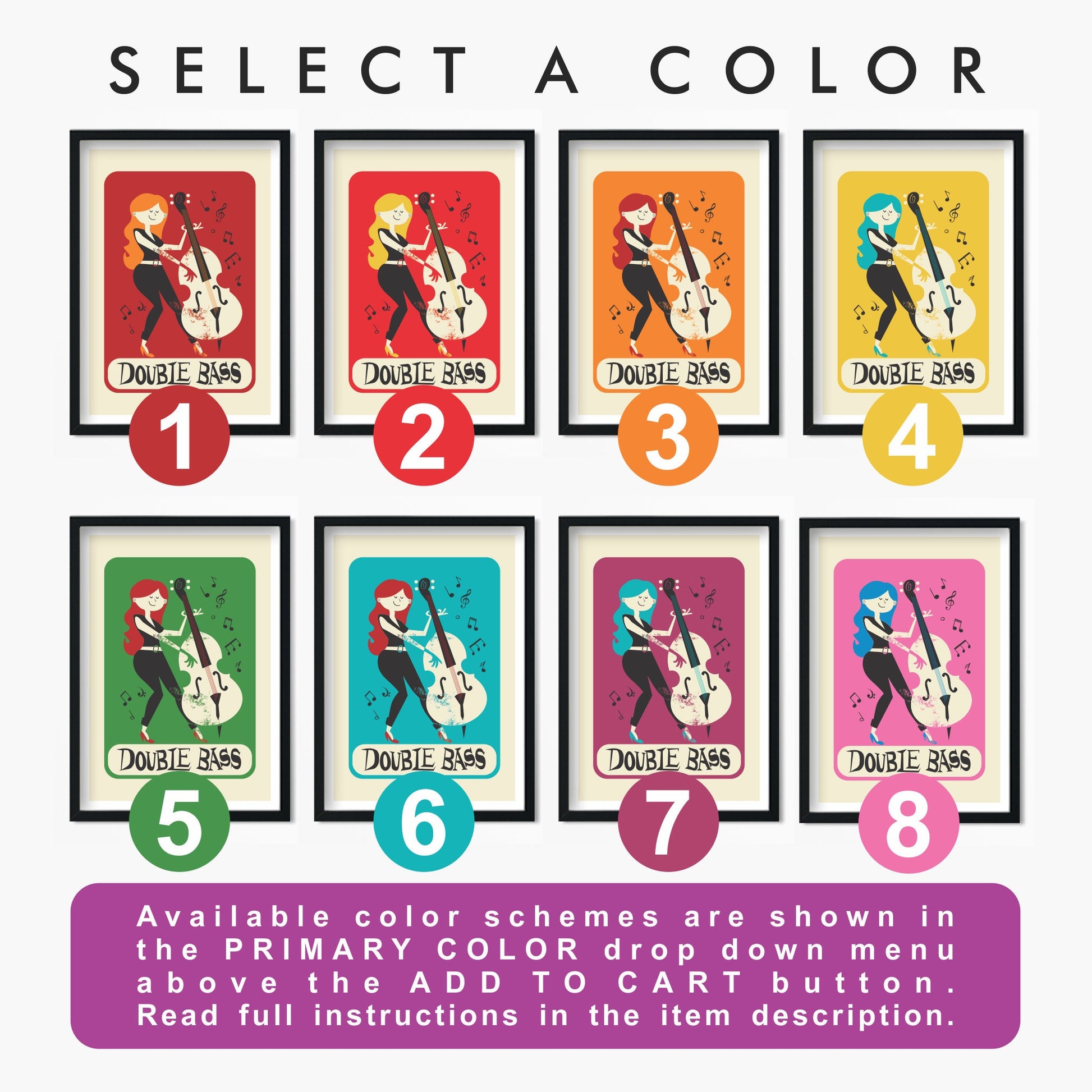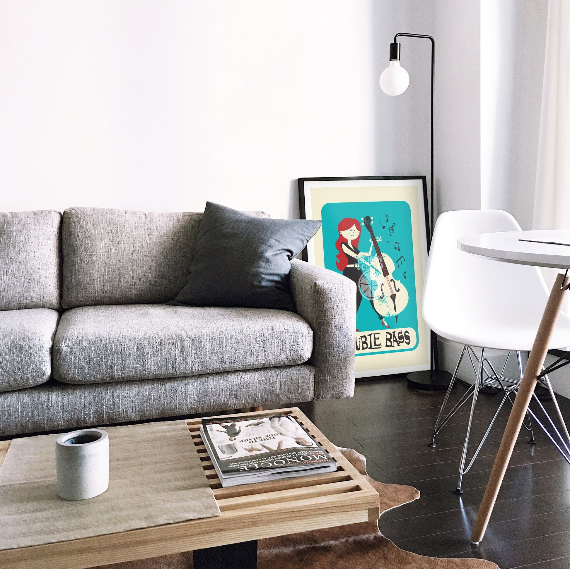 Re-decorate your studio walls with this girl playing the double bass! Full of retro charm and a vintage typography, this print is a must have for anyone who loves classic or jazz music.