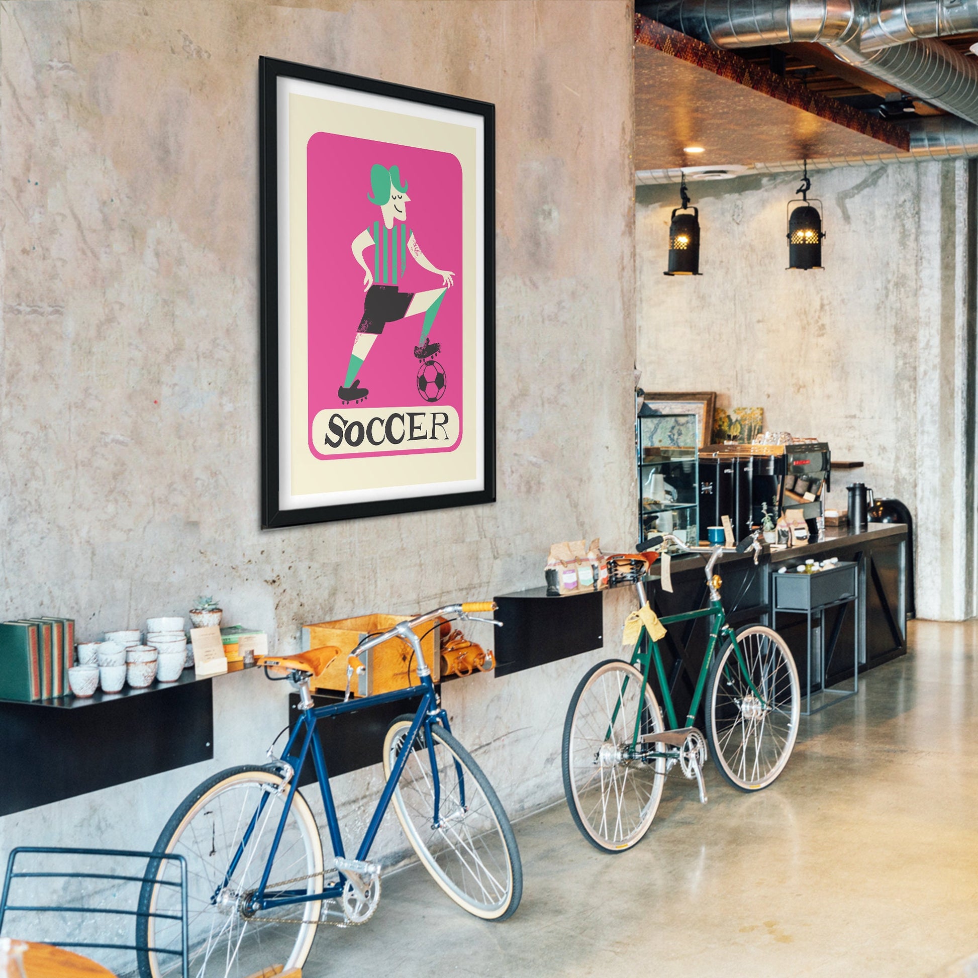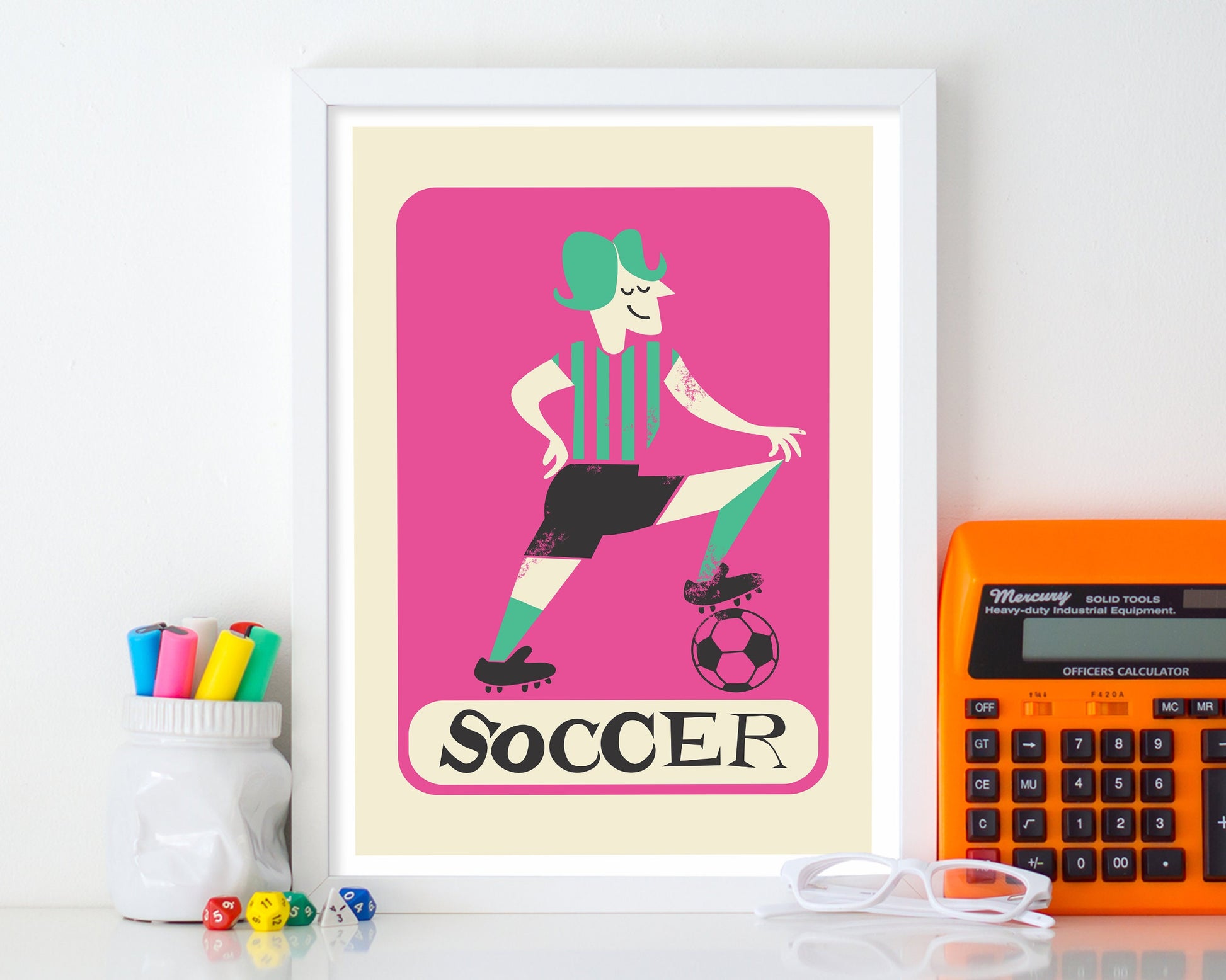 Colorful, fun and retro poster of a soccer player. This adorable print is an excellent gift for that friend who loves sports!
