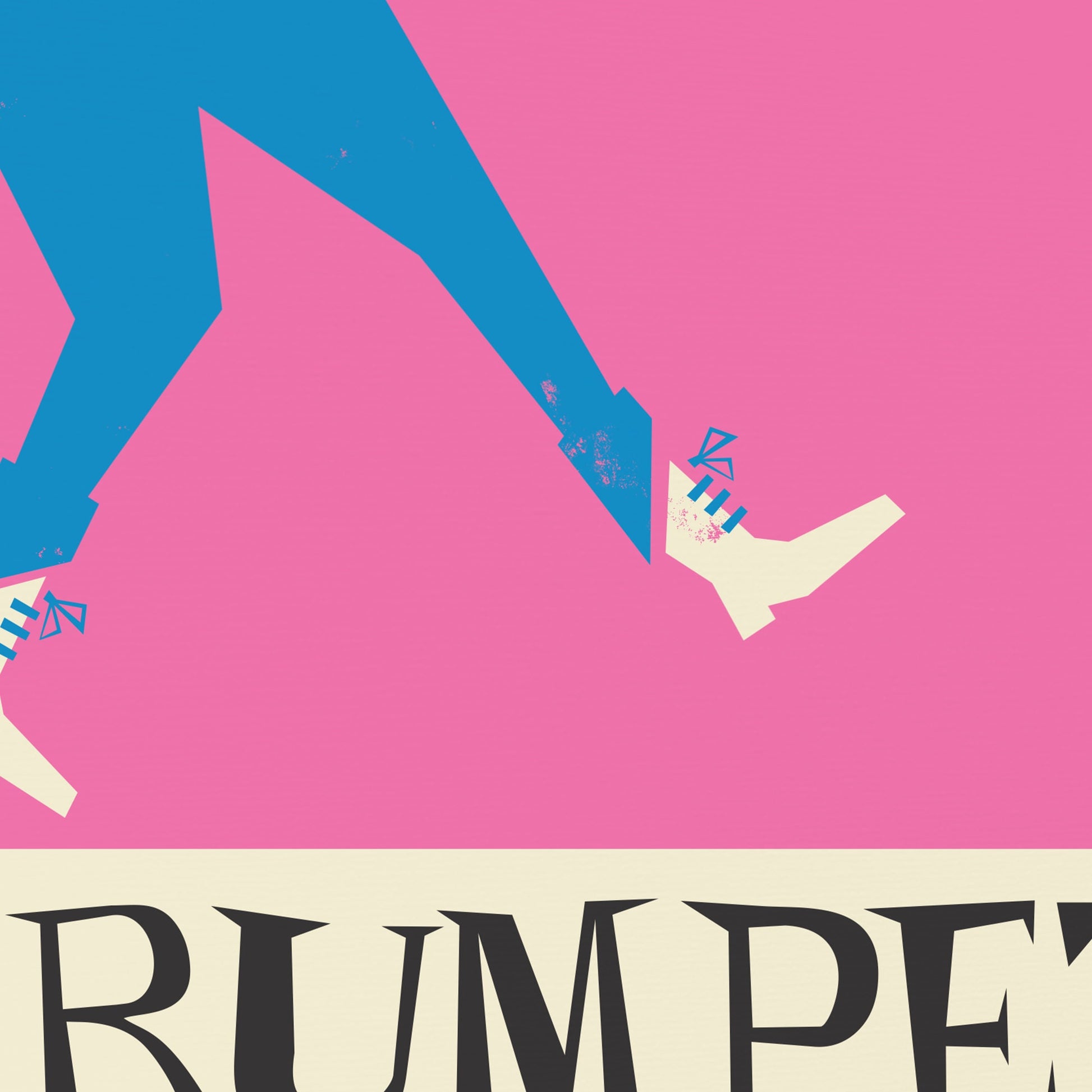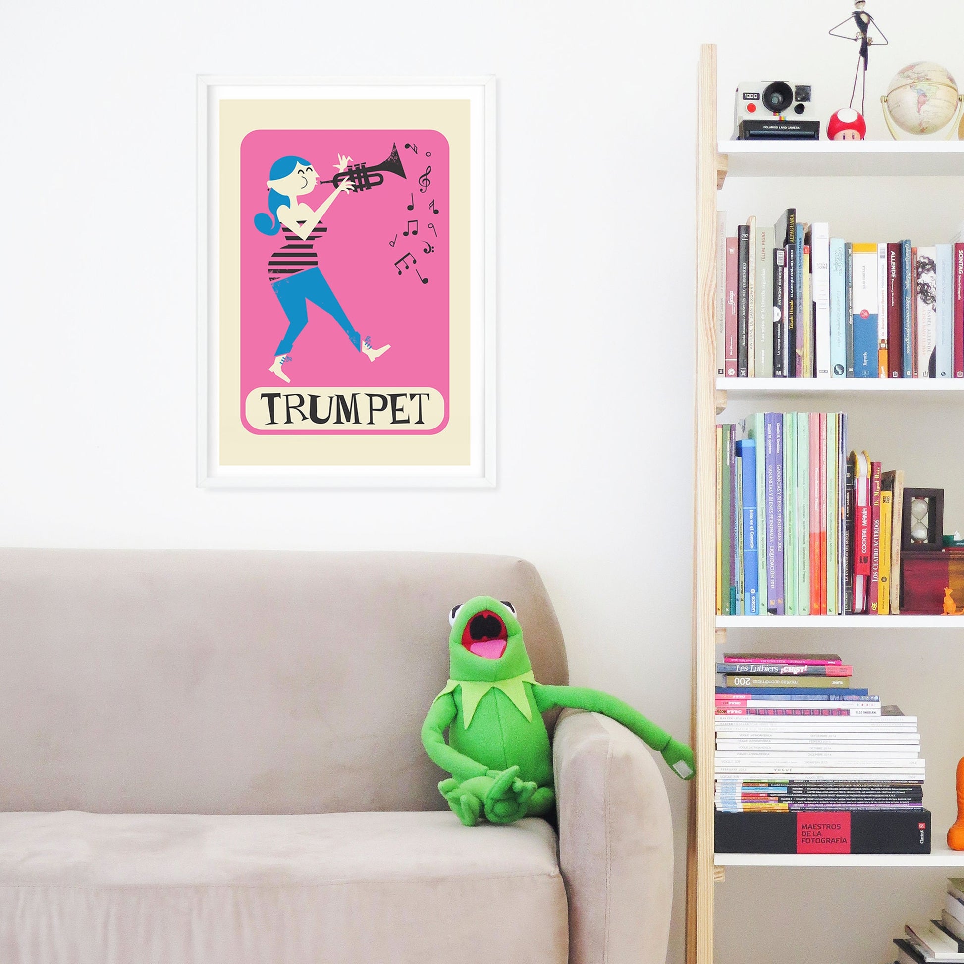 This Trumpet music poster is a fantastic home office decor. The palette is a combination of a deep pink, a cyan and a cream khaki, created in a Mid-century 1960s style. Perfect print for a teen bedroom, a living room or music room.