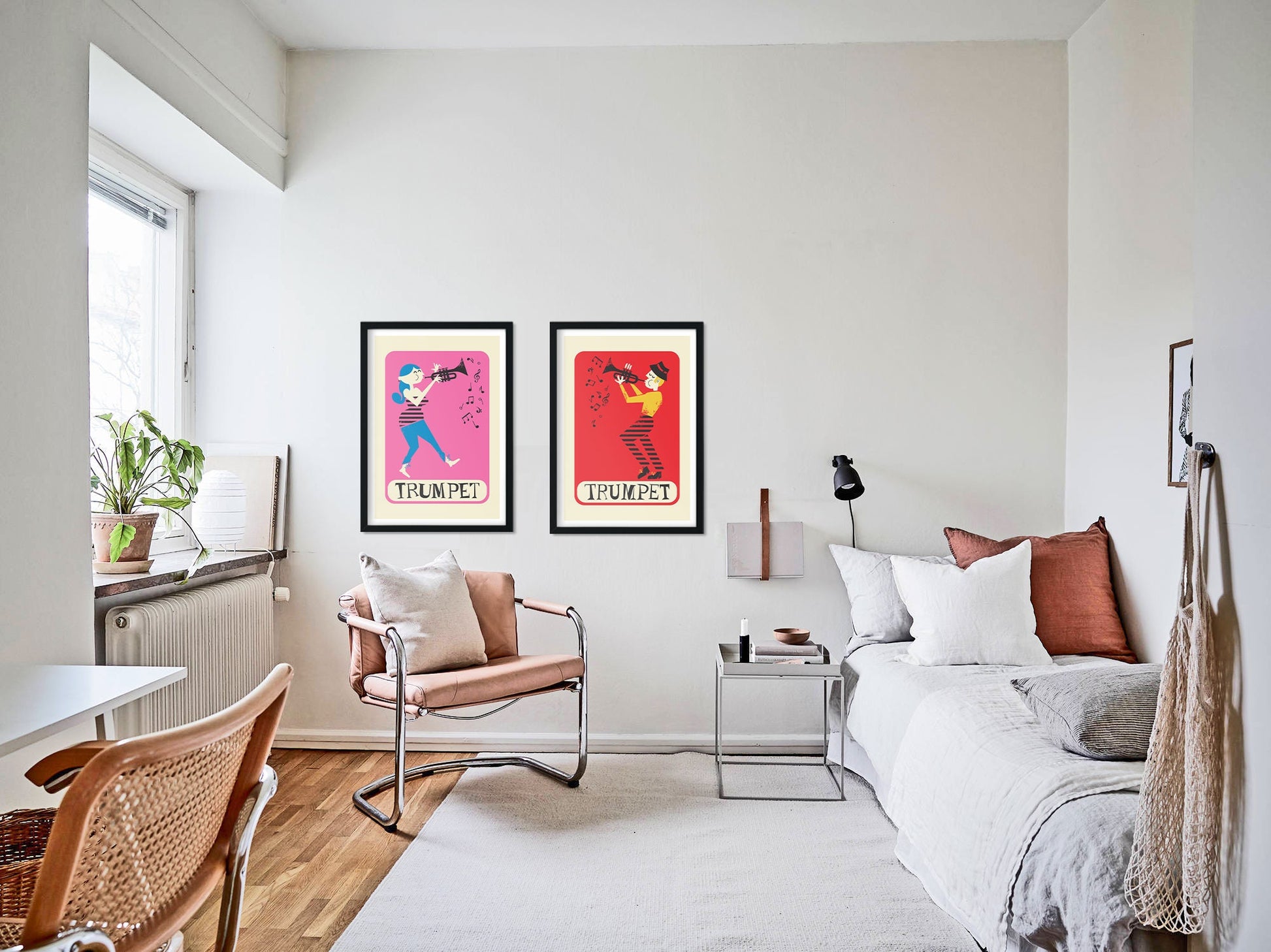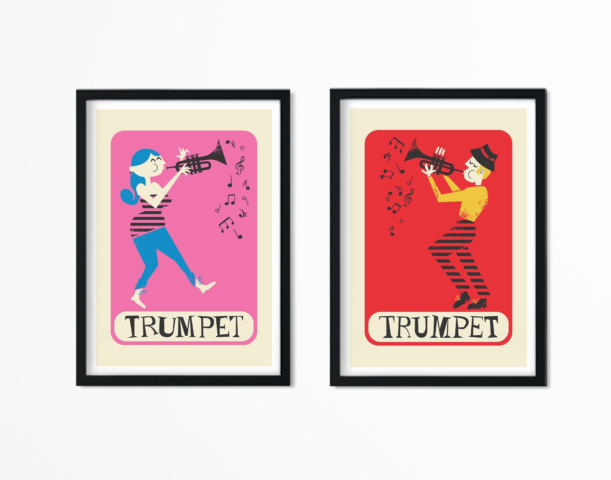 Fun and stylish design with a retro vibe, this set of two prints is a must have for anyone who plays the trumpet! Also, if you personalize both designs, it will make the perfect gift! Select your color choice from the drop down menu (read instructions below) and please leave the name or text in the "Add your personalization" tab.
