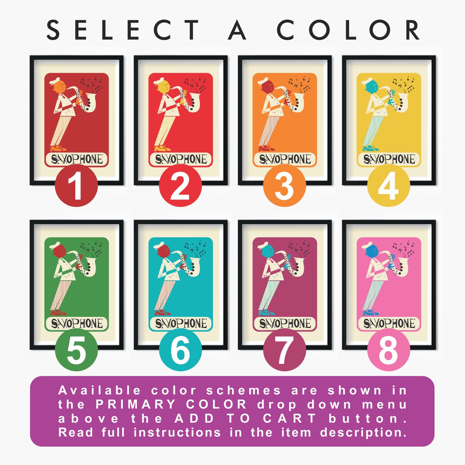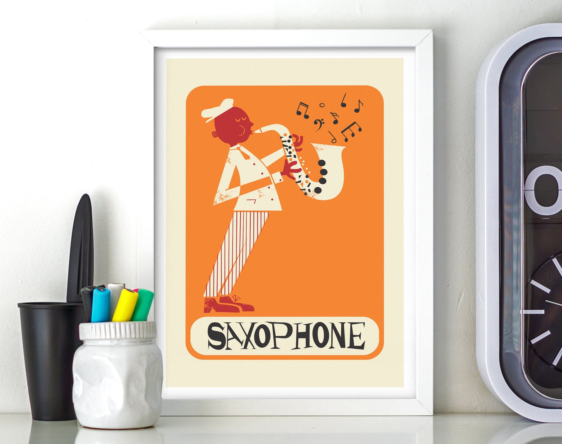 As a minimal and retro design of a saxophone player, this print is for music lovers alike. It makes a wonderful gift for that someone special... or for yourself!