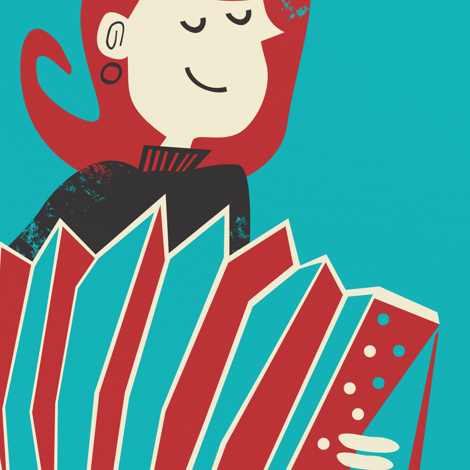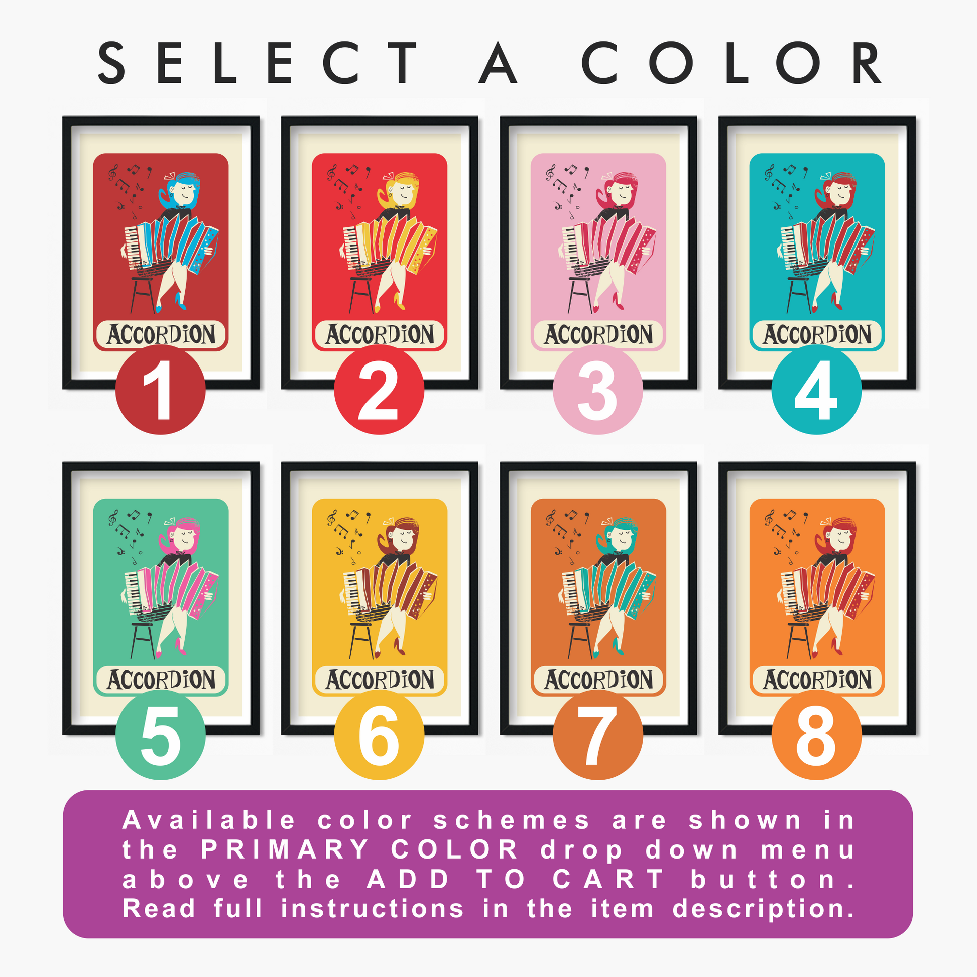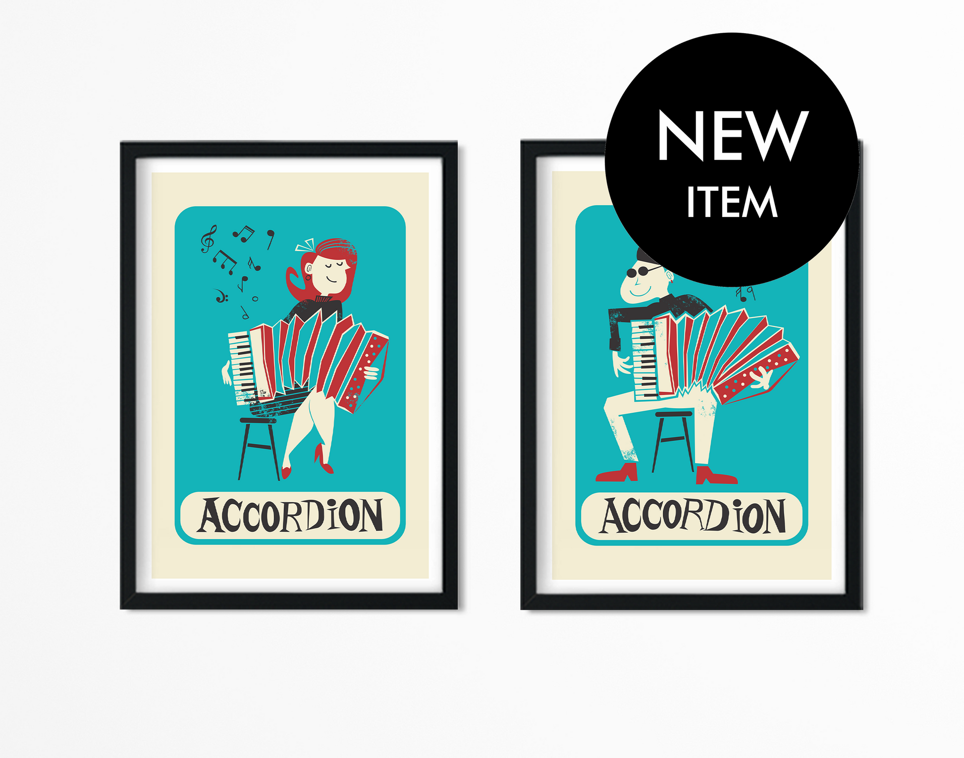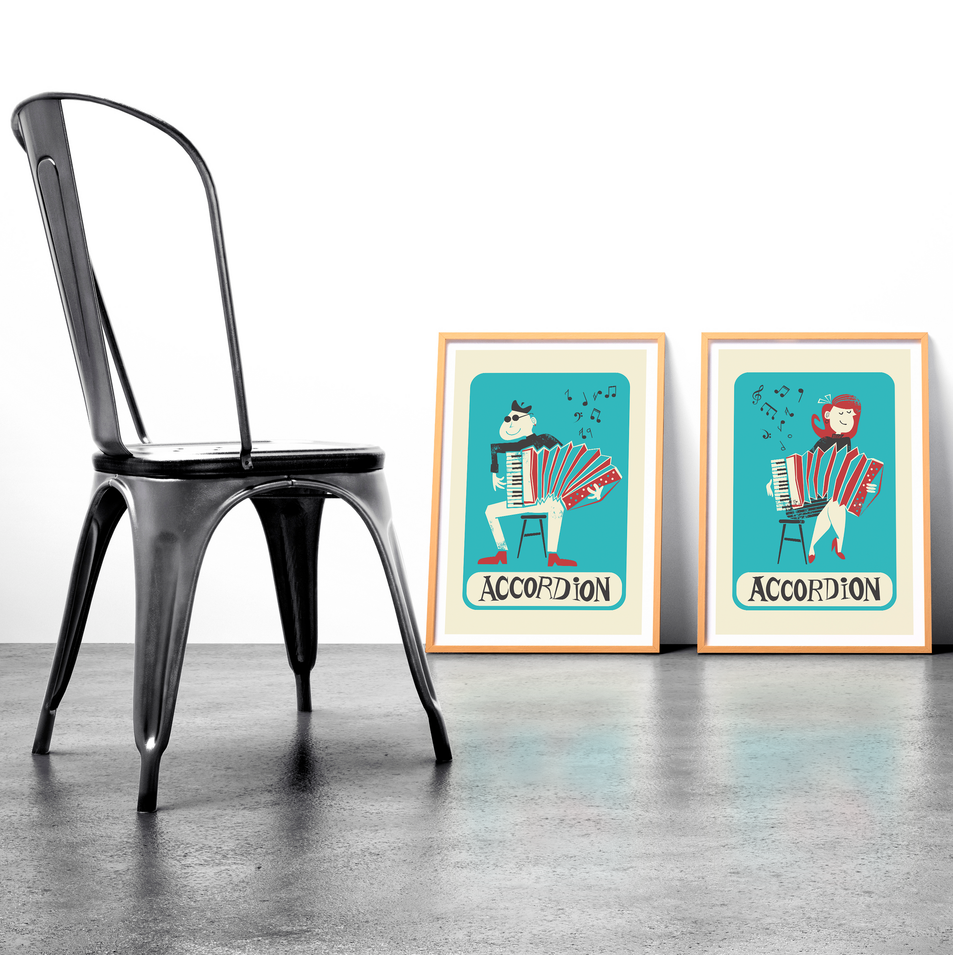This charming pair of accordion player illustrations brings a nostalgic 1950s vibe. Perfect for adding a fun, personal touch to your music space! Plus, you save up to 10% by purchasing these prints together!