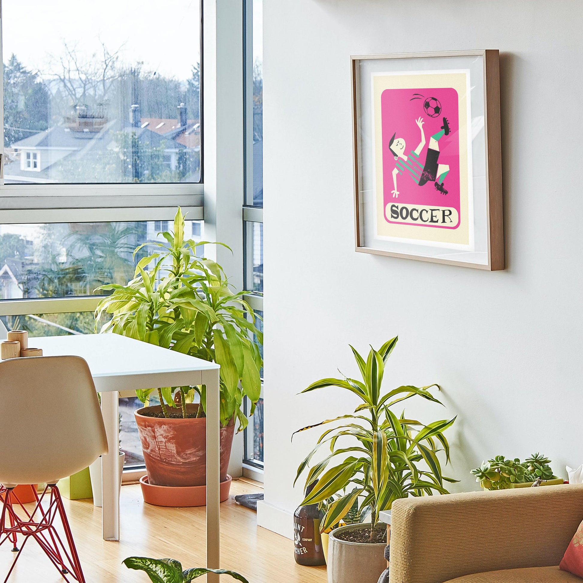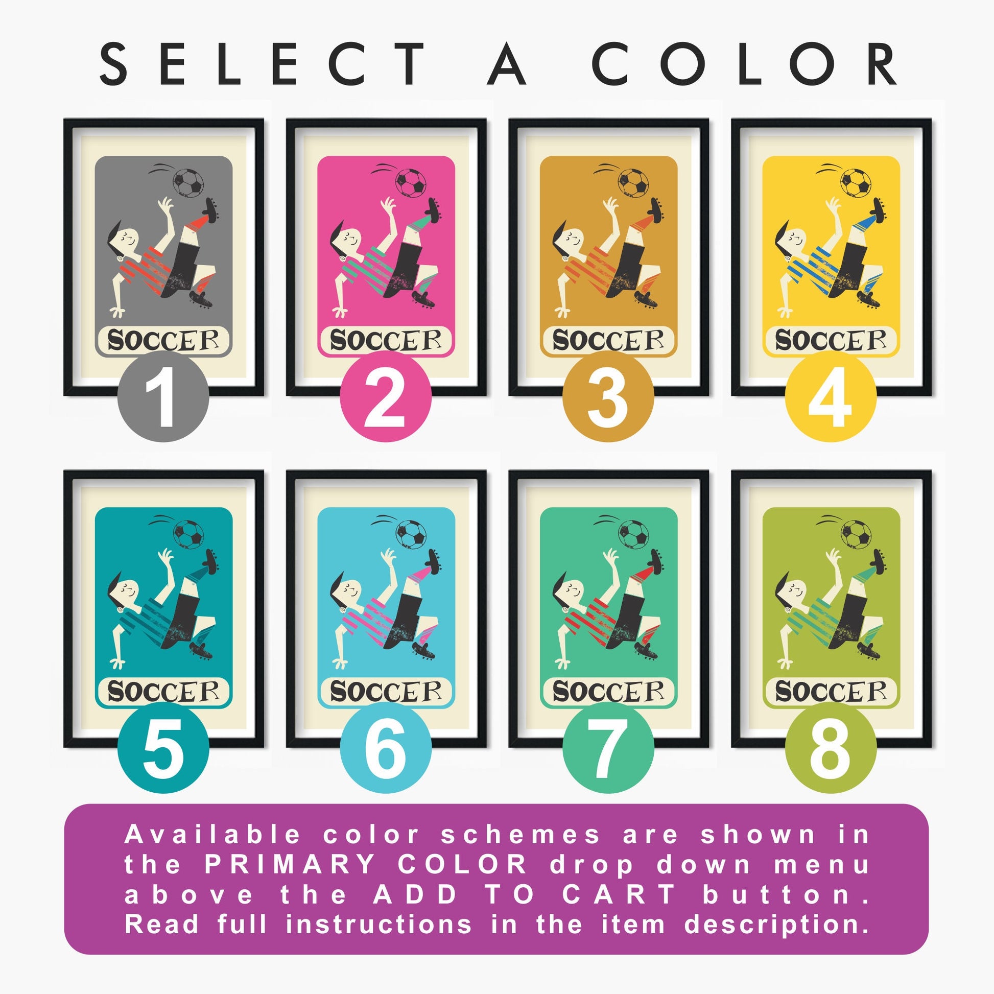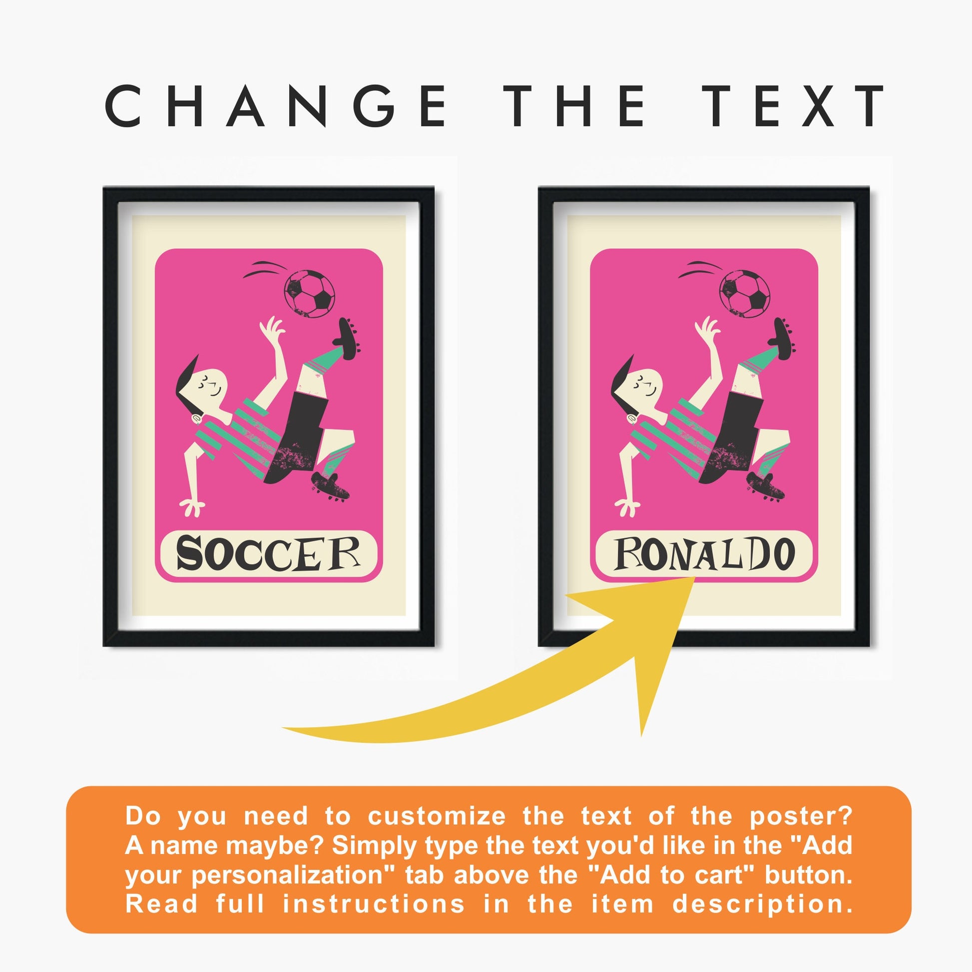 Designed in a vintage-looking style this soccer (or football) player artwork will catch the eye when placed on a wall. You can personalize it, choosing the colors and placing a name. Read full instructions below.
