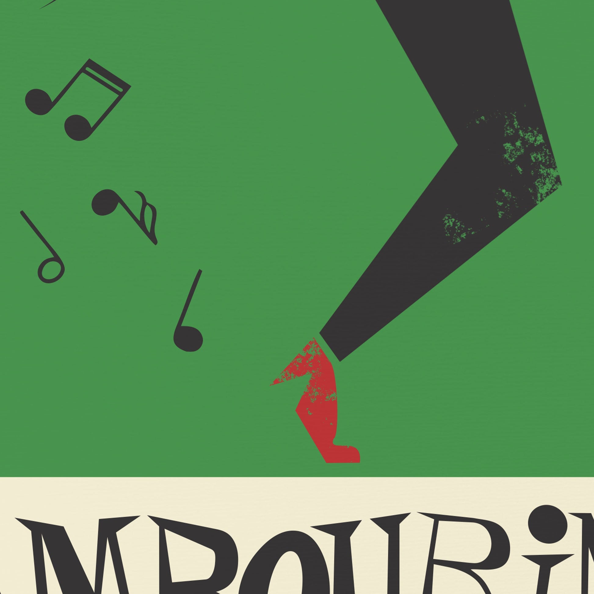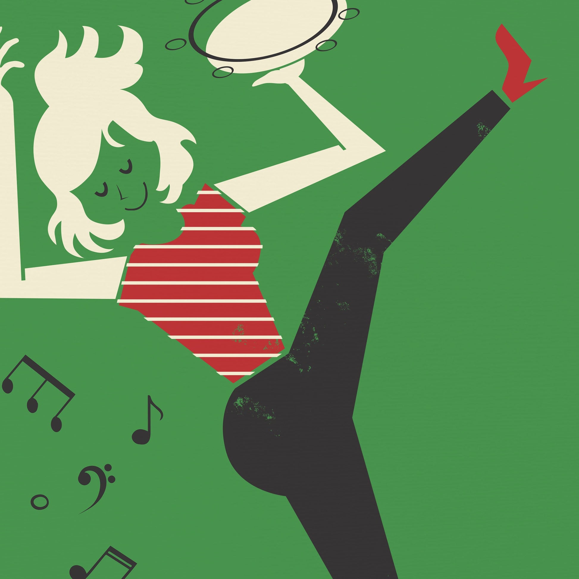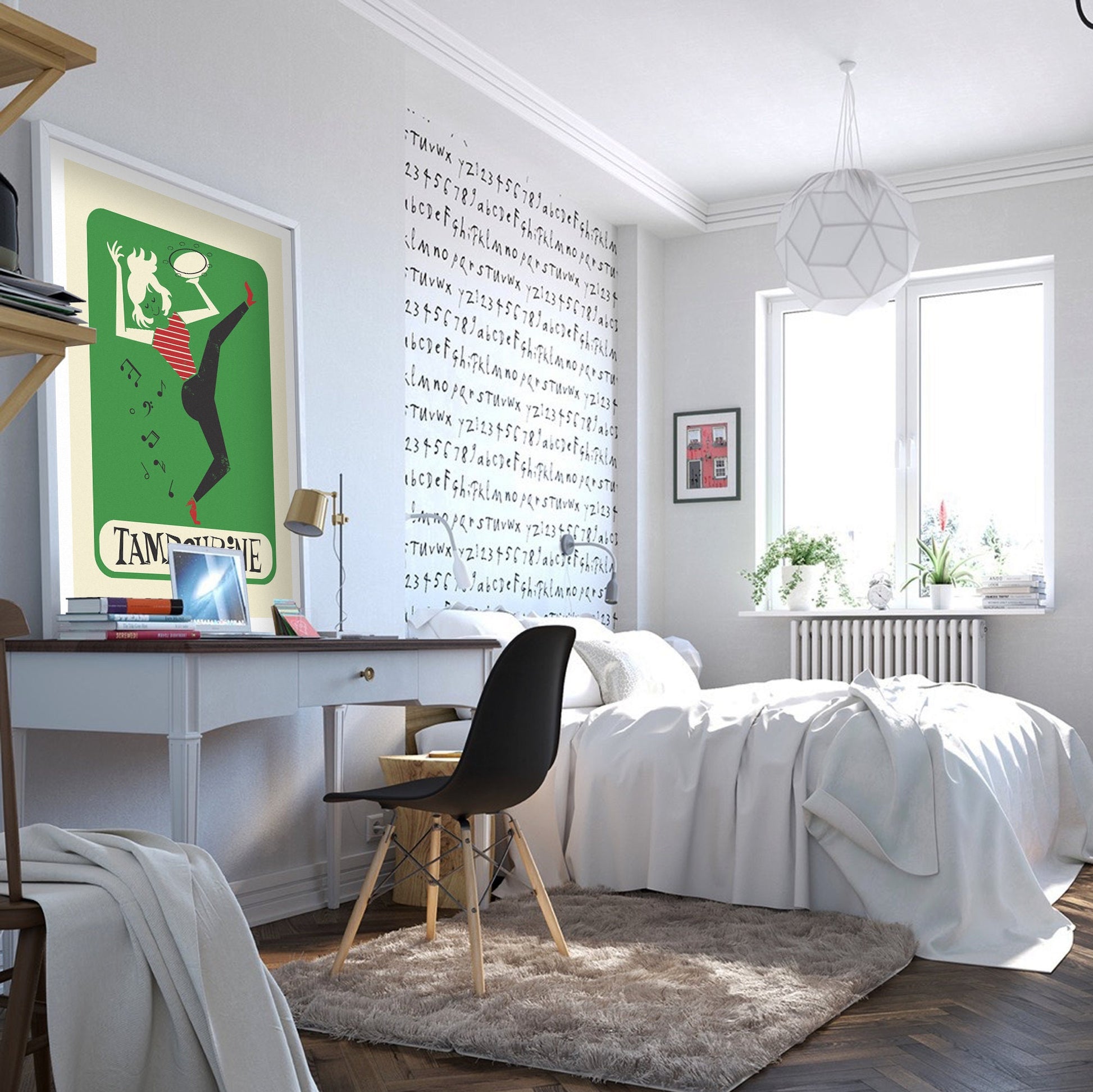 Poster designed in a minimal and retro style of a girl playing the tambourine. This print is a must for any girl's room or graphic design geek!