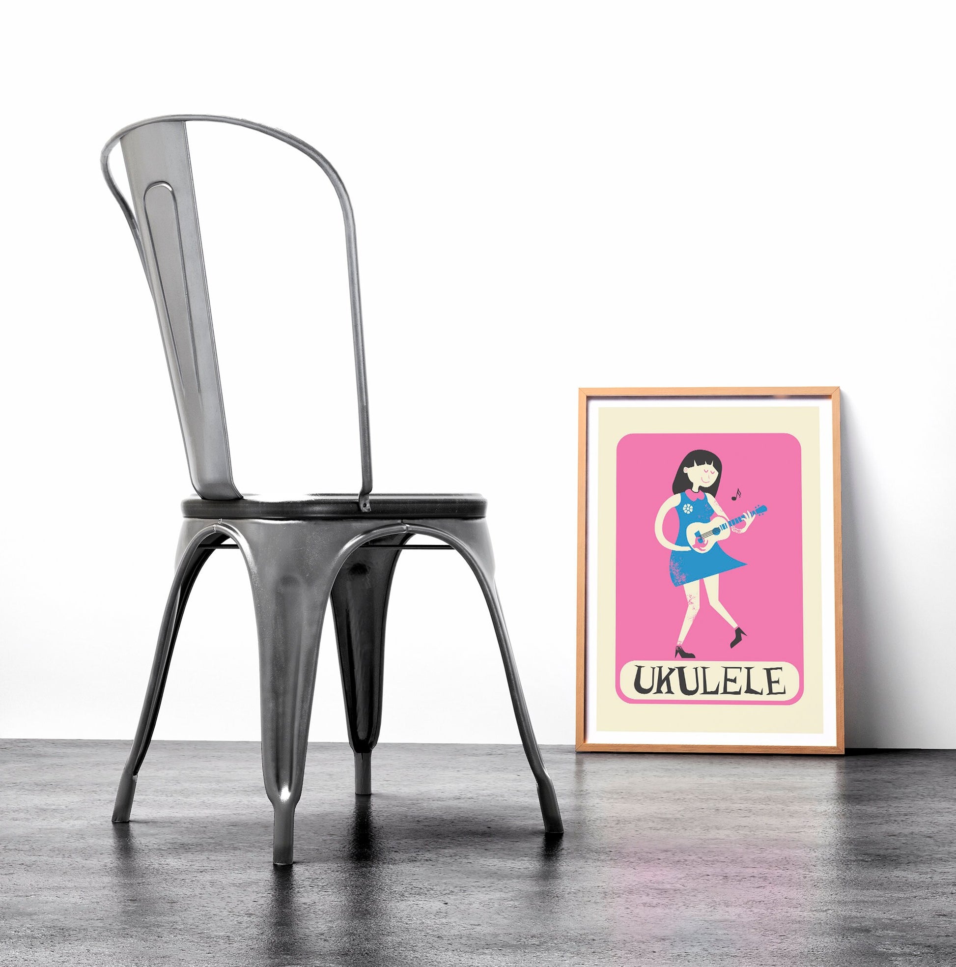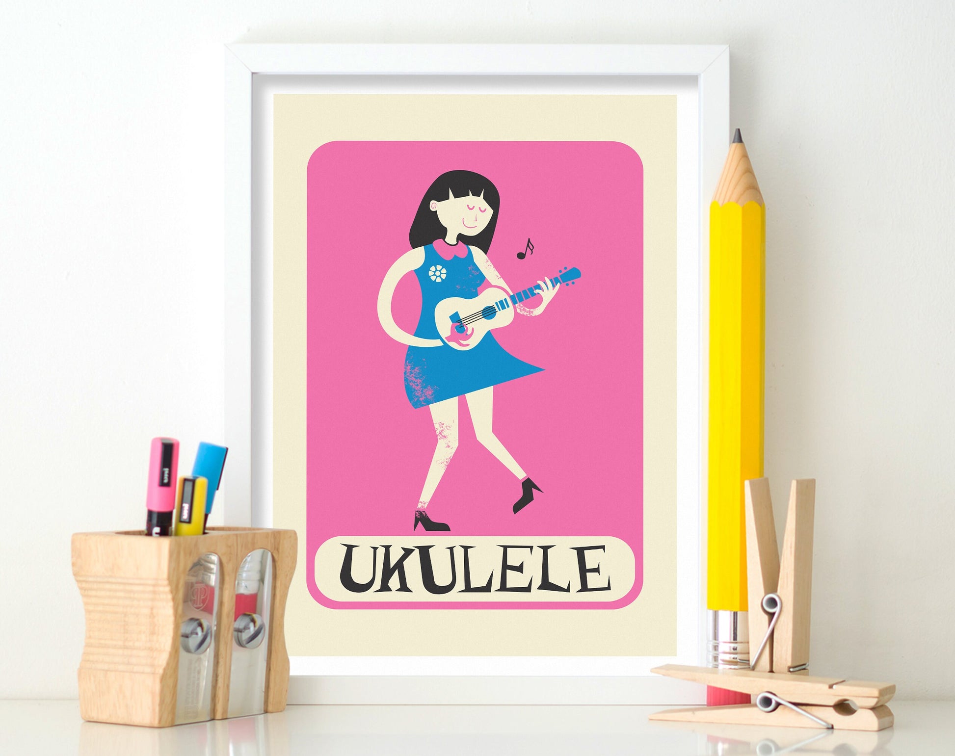 Vibrant print of a girl playing the ukulele. Perfect decoration for your daughter's or sister's room!